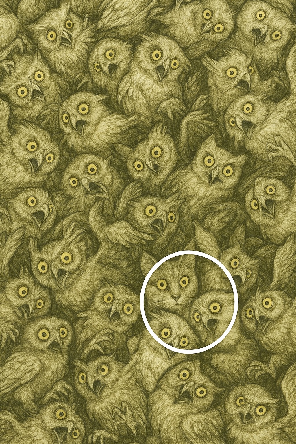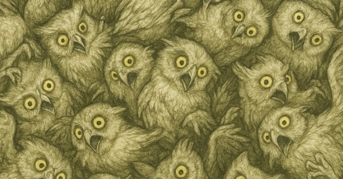 Első pillantásra ez az illusztráció úgy néz ki, mint egy kaotikus bagolygyűlés, széles, meglepett szemekkel. Puha tollazatuk és azonos arckifejezésük miatt a kép zsúfoltnak és zavarosnak tűnik. De a baglyok tengerében egy teljesen más állat rejtőzik, és észrevenni nem olyan egyszerű, mint amilyennek látszik. Ez az okos műalkotás kihívást jelent a legapróbb részletek észrevételére a túlnyomó ismétlődések közepette.