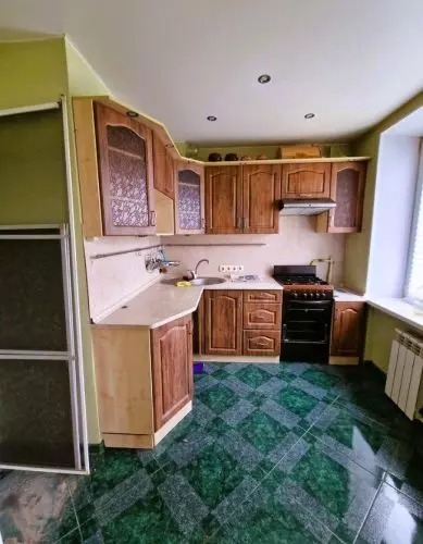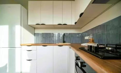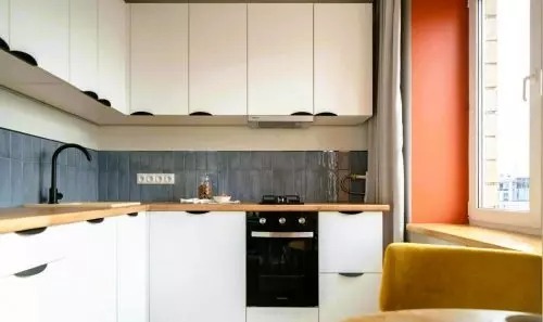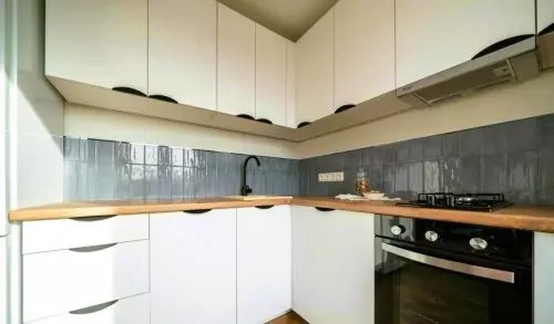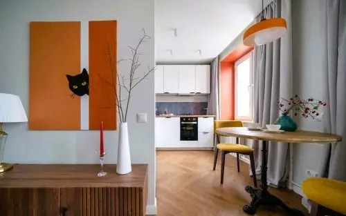 Kompakt mérete ellenére minden szükséges felszereléssel rendelkezik. A fehér homlokzatú sarokkonyha szürke-kék fényes csempével van díszítve. Az étkező a konyha és a vendégszoba között található.