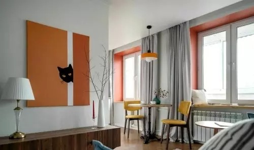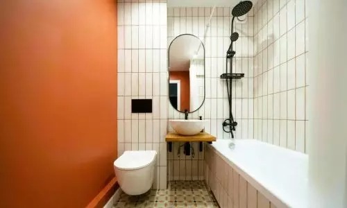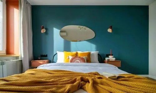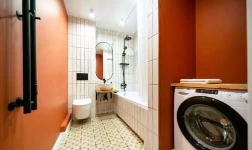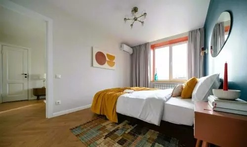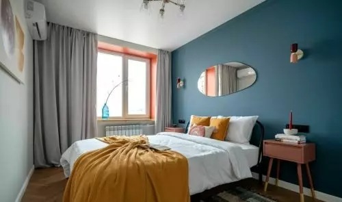 A hálószoba legérdekesebb része valószínűleg a tágas franciaágy felett a falon lógó tükör. A fürdőszoba színeit is jól átgondolták. Fehér és narancssárga színeket választottak.