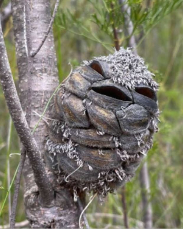 De amikor ráközelített, a valóság beütött – és hangosan felnevetett. Az a „madár” egyáltalán nem madár volt. Hanem egy banksia hüvely, egy furcsa őshonos növény, amely kísértetiesen hasonlított egy apró bagolyra, hamis „tollakkal” és nagy, kerek szemekkel. A természet végső tréfát űzött vele.