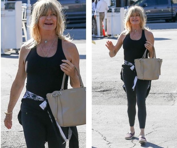 Goldie Hawn kedveli a 80-as évek stílusát, és egyik kedvenc ruhadarabja a leggings, de nem hosszú tunikákkal viseli őket. Általános alakjának köszönhetően azonban Goldie megengedheti magának ezt. Fiatalos ruhákban fotózták az utcán, és nem is szégyellte, hogy alsónemű nélkül viselte a pólókat.