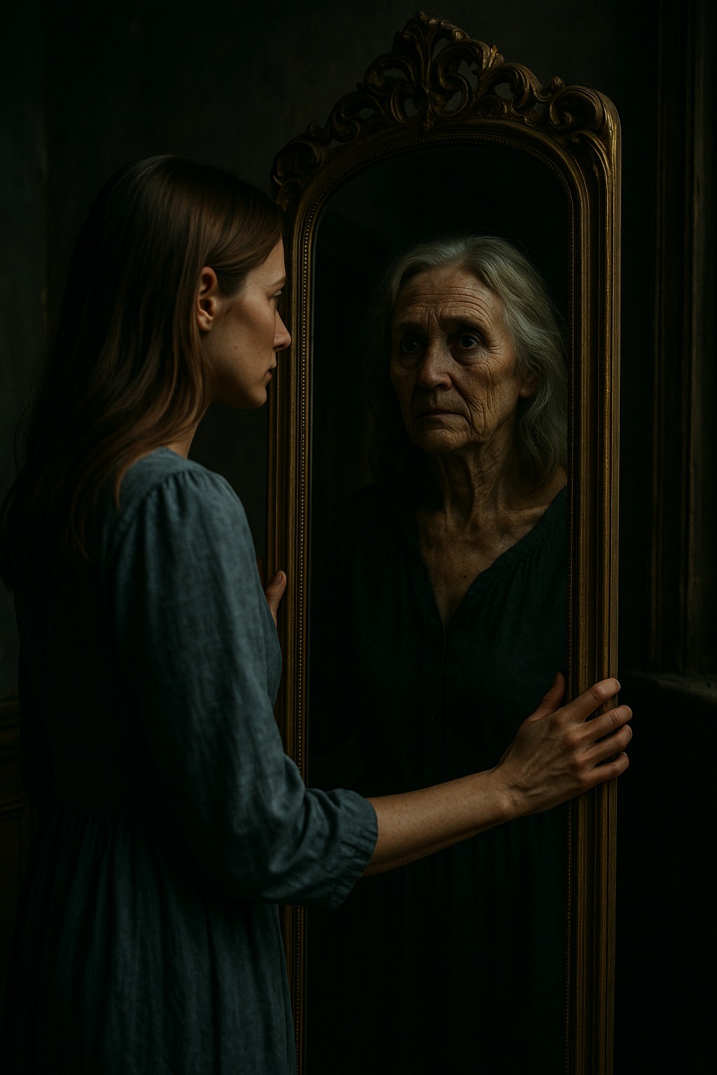 Másnap újra odament a tükörhöz – és megdermedt. A tükörképben a szemei körül ráncok jelentek meg. A valódi arca a fürdőszoba tükrében sima maradt, de az antik tükörben öregebbnek látta magát.