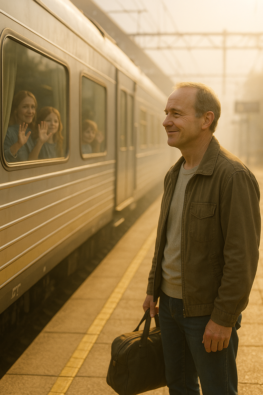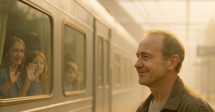 Amikor a vonat elindult, a gyerekek integettek neki az ablakból. Ő a peronon állt, kezeit a levegőbe emelte és mosolygott.