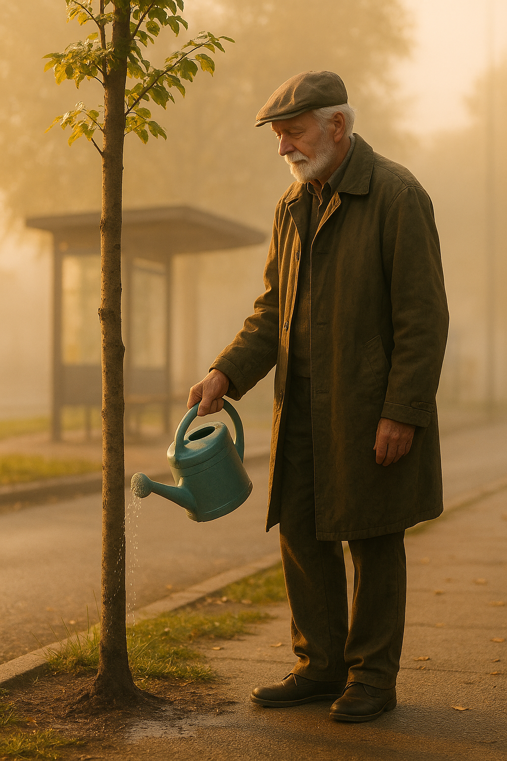 Minden reggel, pontosan fél nyolckor, megjelent egy kis műanyag locsolókannával, és meglocsolta a fát a megálló szélén.