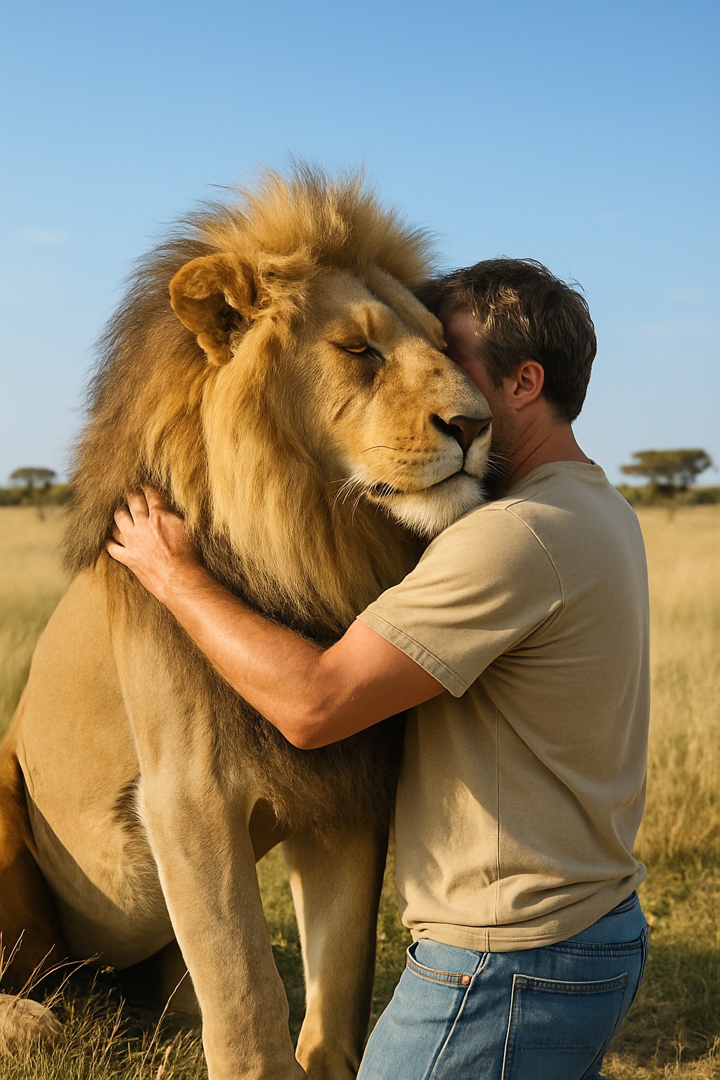 Az oroszlán odalépett, megállt fél méterre — és… finoman a mellkasának nyomta a fejét, mintha hozzábújna.