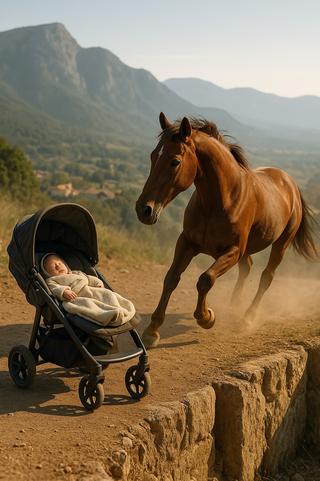 Bella átugrott a törött kapun, és nyerítve egyenesen a guruló babakocsi felé rohant. Másodperceken belül utolérte, és mellkasával a fogantyúba csapódott, letérítve az útjáról. A babakocsi az oldalára borult, néhány lépésnyire a szélétől.