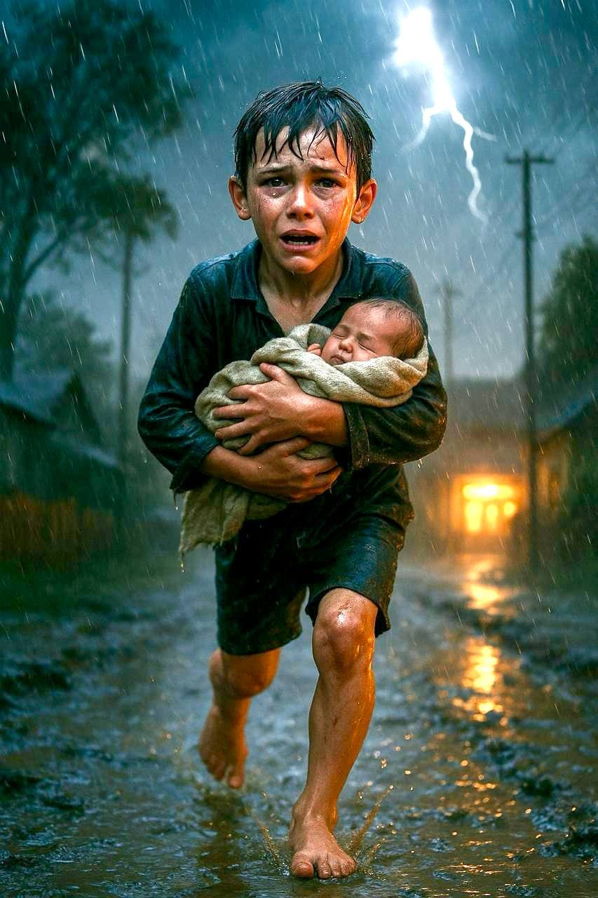 Eső verte a háztetőket, a szél tépte az ágakat, mintha ki akarná tépni a falut. Az éjszaka olyan fekete volt, mintha maga a sötétség borult volna a földre. A mennydörgés dübörgése és a süvítő szél közepette egy Timofej nevű kisfiú mezítláb futott az elárasztott úton. Csak nyolcéves volt. Arca sebhelyes volt a tűztől, szemei hatalmasak voltak, tele könnyekkel és félelemmel. De a karjában tartotta a legdrágább dolgot, amije volt: egy apró csomagot, egy apró életet – újszülött húgát.