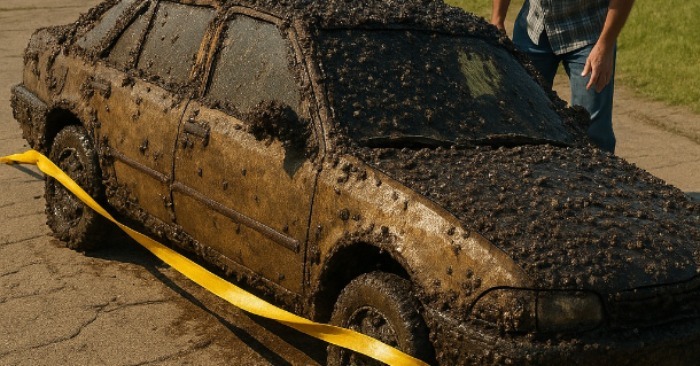 A férfi egy híd közelében merült, ahol a legenda szerint „az autók megfulladnak”, amikor hirtelen furcsa fémes csillogást vett észre egy iszapréteg alatt. Először azt hitte, hogy egy régi építmény része vagy elsüllyedt törmelék. De ahogy közelebb úszott, kivette egy autó körvonalait, félig eltemetve az üledékben. A karosszériája szinte teljesen rejtve volt – csak a tető alig látszott a vastag iszap és a zavaros víz alatt.