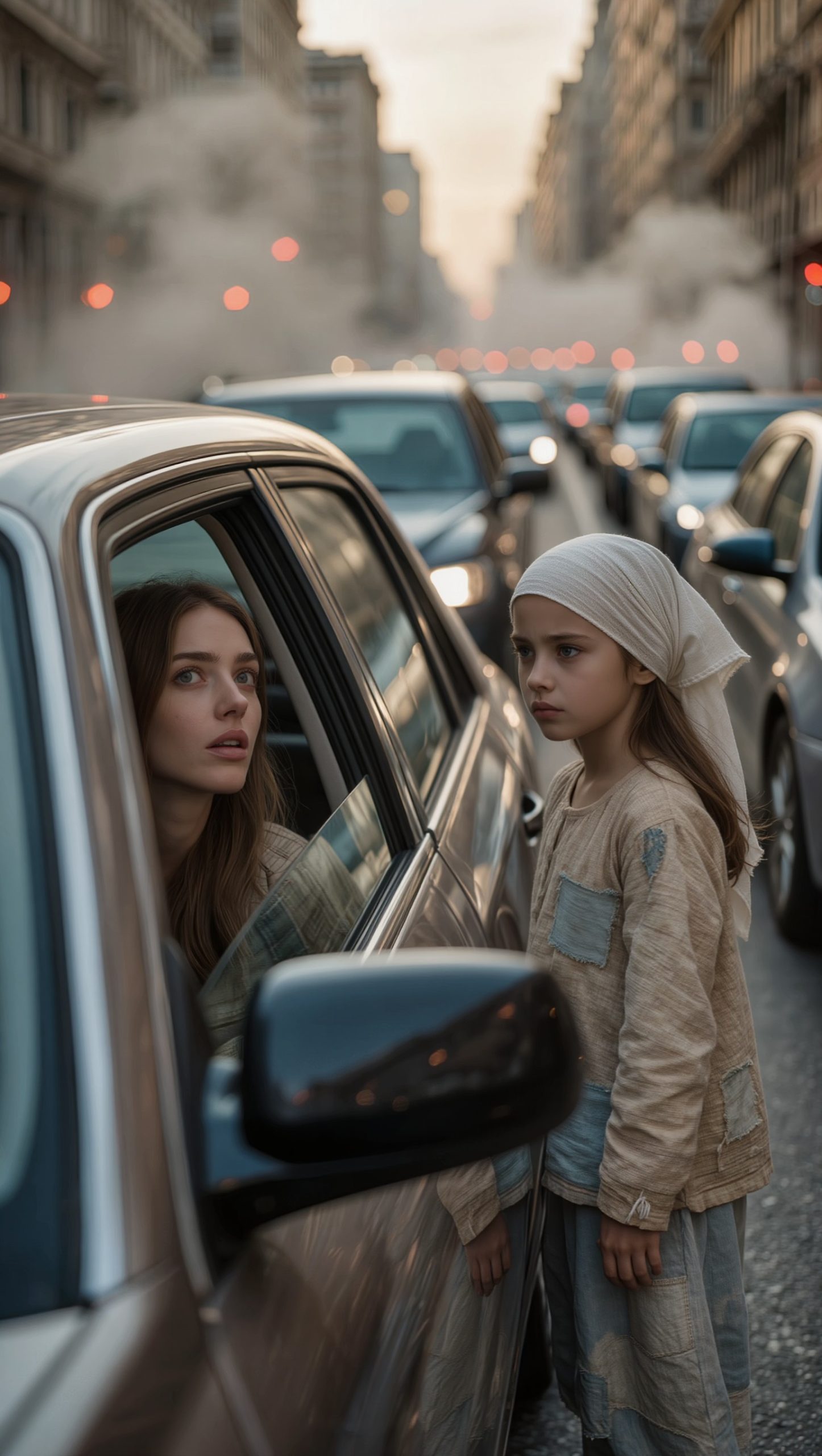 Egy kislány állt mellettem. Nem lehetett több öt-hat évesnél. Csuromvizesen, egy régi kabátot viselt, a haja befonva, az egyik kissé laza volt. Egyenesen rám nézett – nyugodtan, félelem nélkül, mintha tudná, ki vagyok.