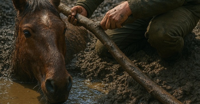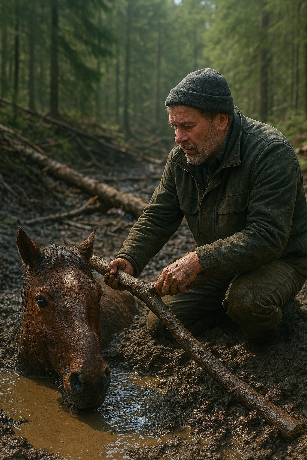 A bokrokon keresztül keresgélt, míg egy nagy pocsolyához nem ért, és meglátta a lovat. Vad, sovány, hasig sárral borítva. A lába egy hatalmas törzs alá szorult, a vihar lesodorta. Az állat remegett, szeme könnyektől és félelemtől csillogott. Minden egyes kiszabadulási kísérlettel a fa csak erősebben nyomta a patáját.
