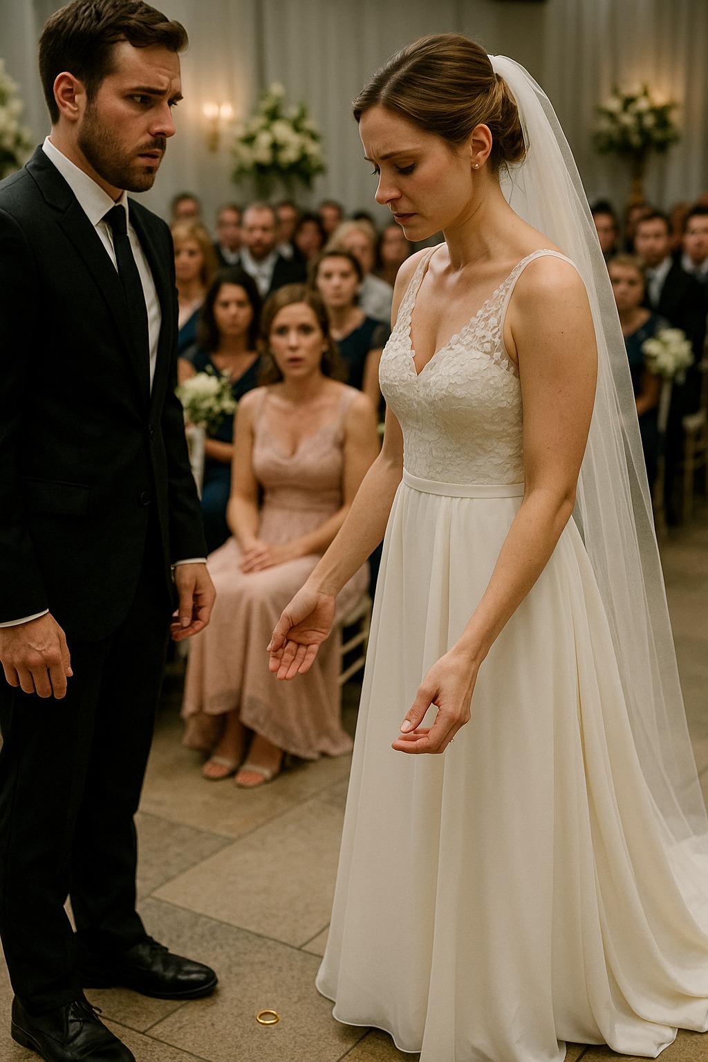 Levette a gyűrűt, a vőlegényre nézett, és lassan letette a padlóra. A gyűrű a kőnek csattant, a hang úgy visszhangzott a teremben, mint egy ütés.