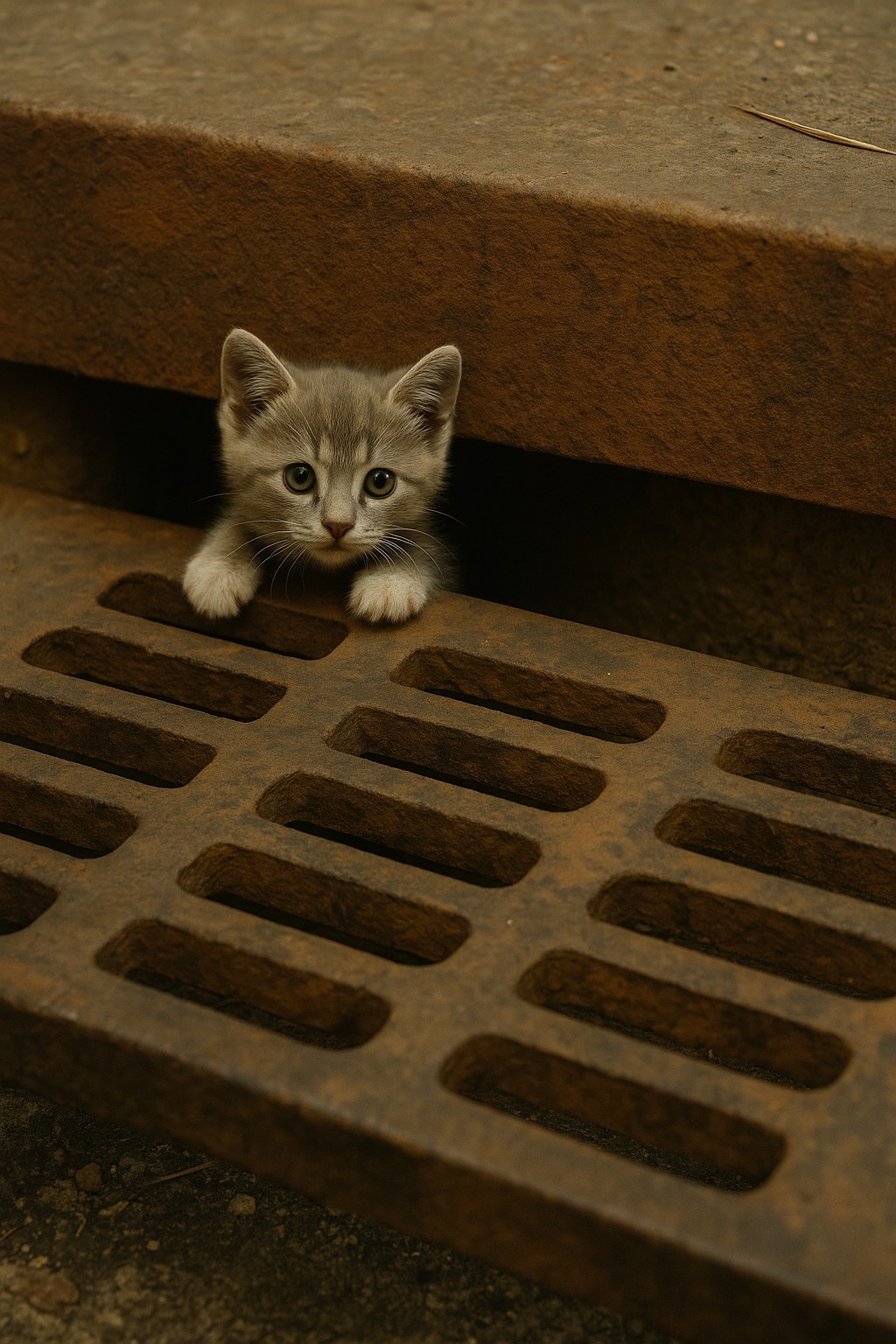Megálltam. „Kitty-kitty…” – kiáltottam. Aztán a vízelvezető aknát takaró rozsdás rács alól egy kétségbeesett visítás hallatszott. Közelebb léptem – és valóban, láttam egy apró, szürke kiscicát, beszorulva a fémrácsok közé. Nyújtogatta a mancsát, próbált kiszabadulni, és hatalmas, rémült szemei voltak.