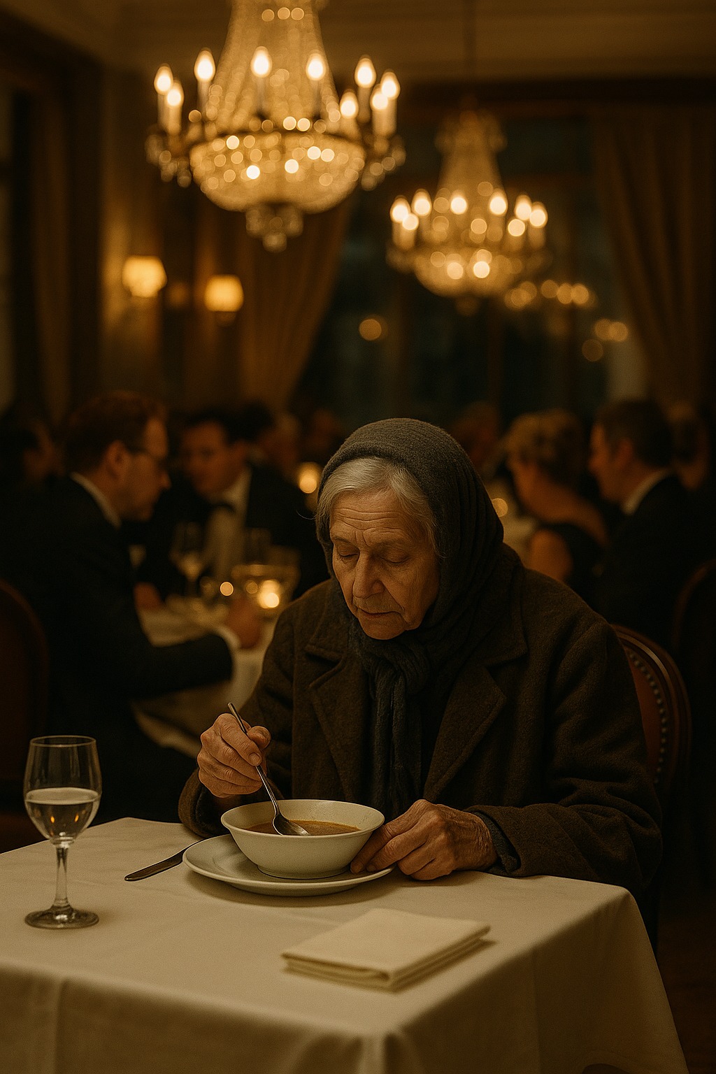 Hozták a levest. Egyszerű, zöldséges húsleves. A nő lassan, nyugodtan evett, mintha nem vette volna észre sem a suttogásokat, sem a gúnyolódásokat. Amikor befejezte, odahívta a pincért és számlát kért.