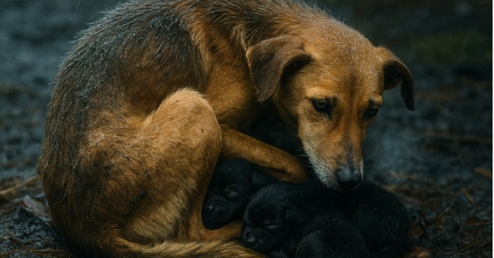 Követte a hangot. És meglátta. A kutya felemelte a fejét. Lassan. Mintha minden mozdulat fájdalmas lenne. Nem morgott, nem állt fel, nem sietett megvédeni a kölyköket – egyszerűen nem volt hozzá ereje.