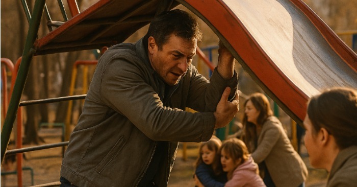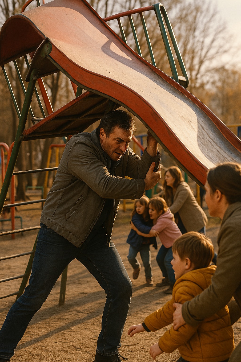 Ugrott. Nem gondolkodott. Nem kiabált. Nem szólt senkinek. Egyszerűen előreugrott, a vállát és a hátát a fémszerkezet alá helyezve. A csúszda, ami teljes súlyával ráomolhatott volna a gyerekekre, rajta nyugodott.