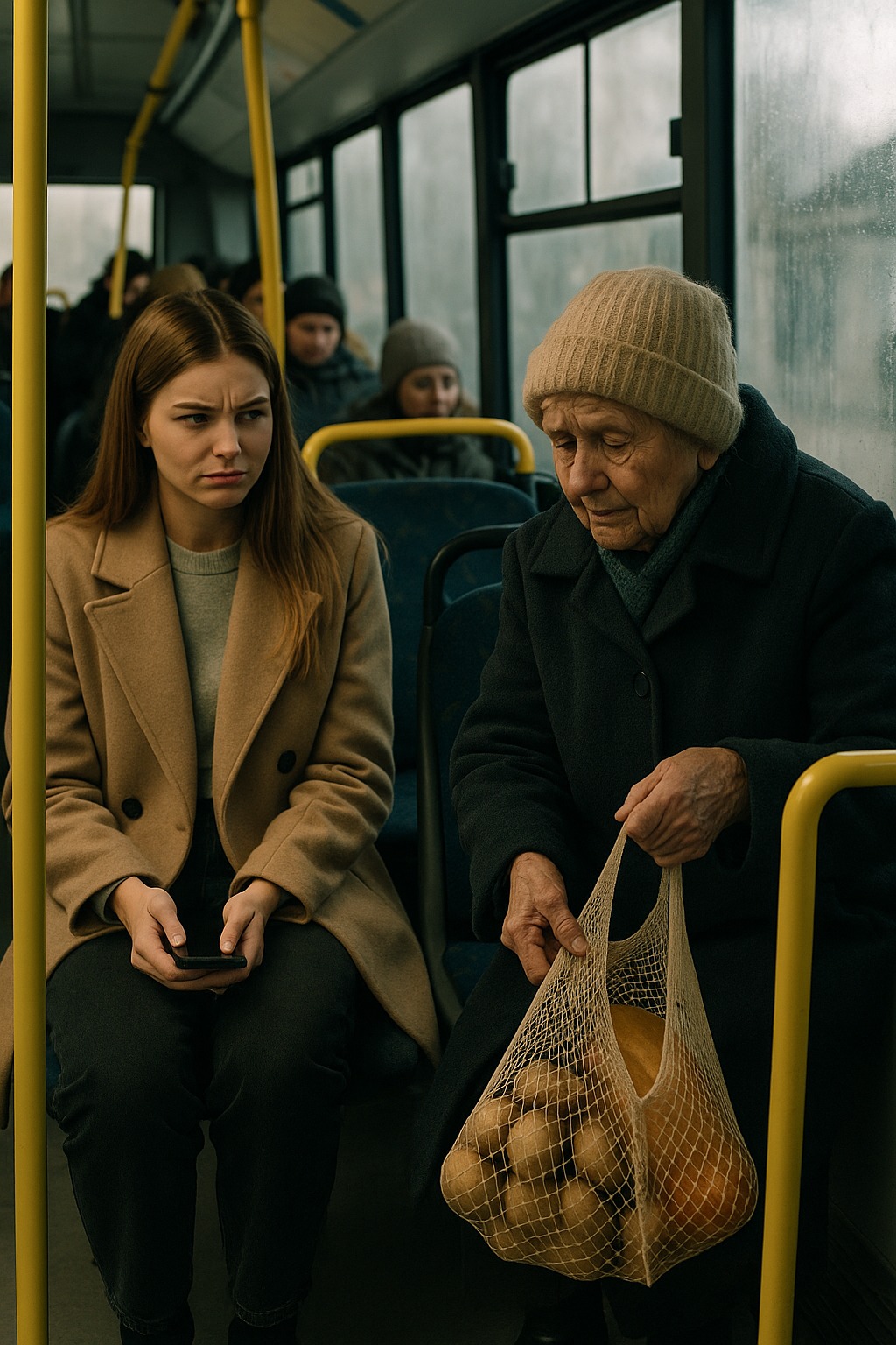 A következő megállónál kinyílnak az ajtók, és egy idős nő lép lassan fel. Alacsony, görnyedt, régi kabátban és kötött sapkában, zacskóval a kezében. Az ujjai vörösek a hidegtől. Aprópénzzel fizeti a viteldíjat, gondosan megszámolva minden egyes érmét.