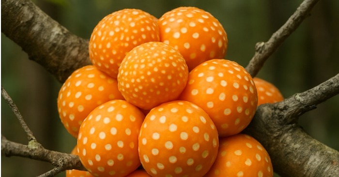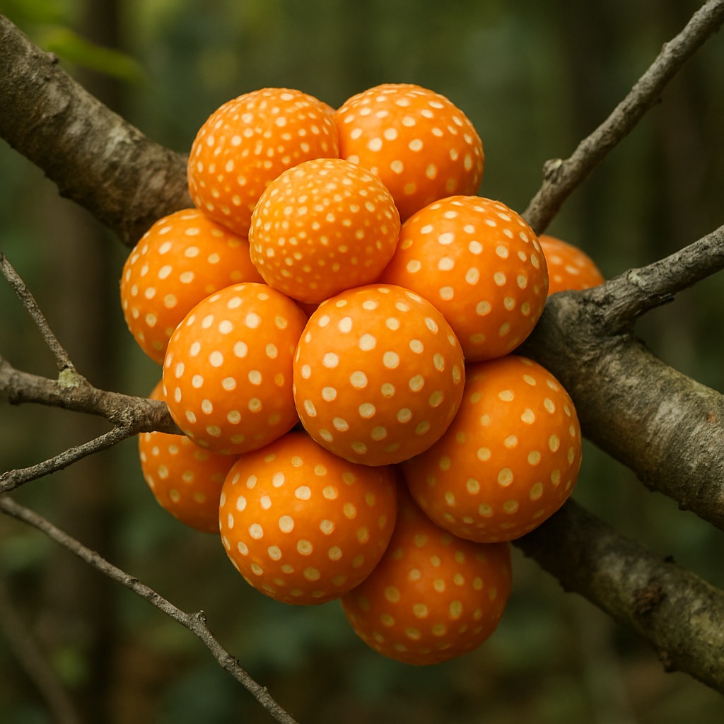 Egy egész csokor narancssárga golyó lógott egy régi, görbe ágról. Túl élénknek tűntek az erdőhöz – mintha valaki szándékosan akasztotta volna oda őket, hogy felhívja magára a figyelmet. A golyók felülete sima volt, apró, világos foltokkal. Melegek voltak tapintásra… szinte élők.
