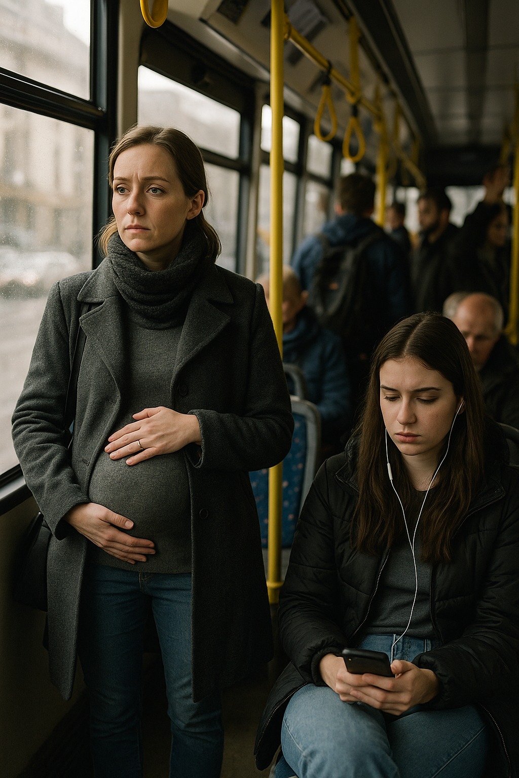 Emma az ablaknál ült, fejhallgatóval a fejében, és a telefonját nézte. A zene elnyomta a zajt; alig vette észre, mi történik körülötte. A következő megállónál egy nő szállt fel – körülbelül harmincöt éves, hosszú kabátot és feltűnően kerekded hasat viselt.