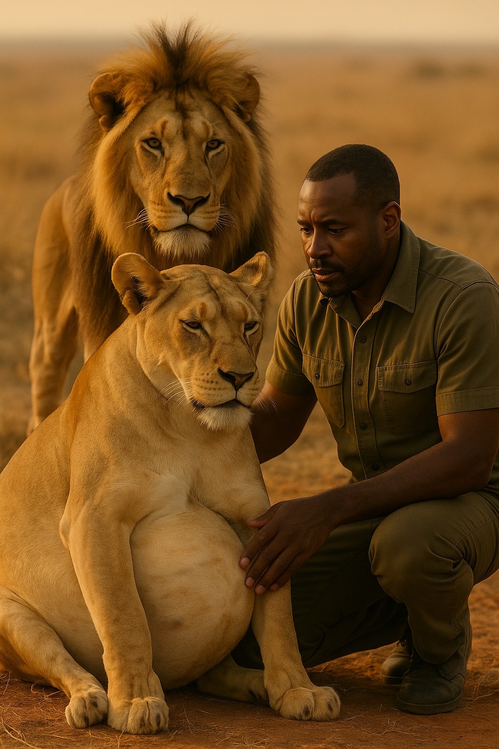 Az afrikai síkság olvadt a napon. A föld száraz volt, mint a hamu, a levegő pedig remegett, mintha tűzben lógna. Két oroszlán sétált át ezen a végtelen mezőn: egy nagy, legyengült hím, elhalványult sörénynel, és vemhes társa, aki alig tudott a mancsain állni. Régóta kerestek vizet, szinte a halál szélén álltak, de a hím nem tágított mellőle, őrizte a sakáloktól, elűzte a keselyűket, és utolsó erejét is felemésztette.