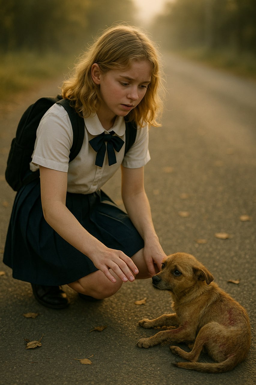 Valami kicsi és sötét mozgott az út szélén. A lány megállt és megdermedt: egy kutya. Kicsi, fiatal, remegő. Horzsolások voltak az oldalán, a bundája véres. Biztosan egy autó ütötte el és hajtott el. Felnézett rá – tágra nyílt szemmel, ijedten, mintha azt kérdezné: „Elmész? Elmész?” És a lány nem tudott elmenni mellette.