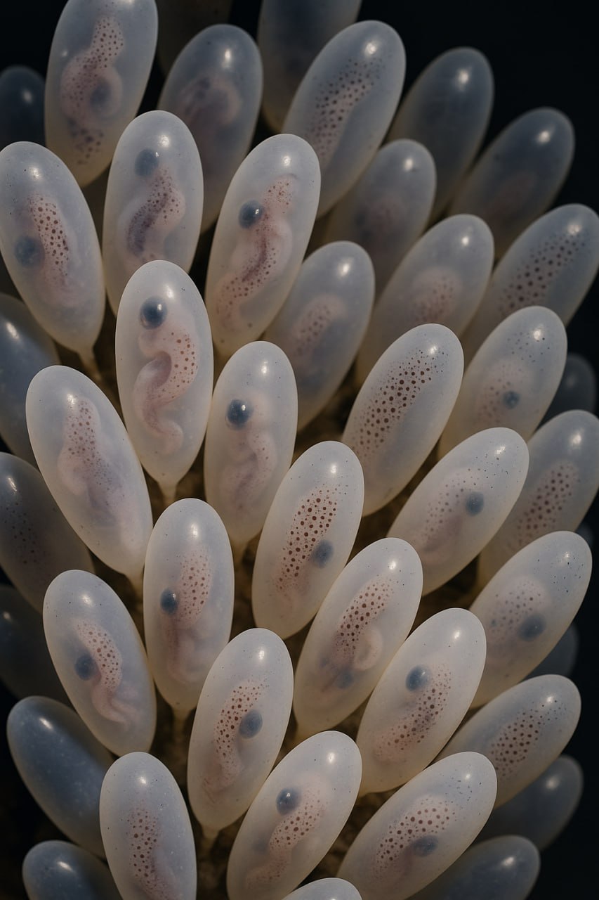 Előttünk… valami élő dolog hevert. Egy egész kolónia furcsa, megnyúlt, tejszerűen átlátszó kapszulákból, szorosan egymáshoz préselődve. Nedves felületük csillogott, mintha valaki gondosan elrendezte volna őket. De a legkísértetiesebb dolog belül volt. Amikor közelebb vittük a zseblámpát, a szívünk összeszorult: valami mozgott minden kapszulában.