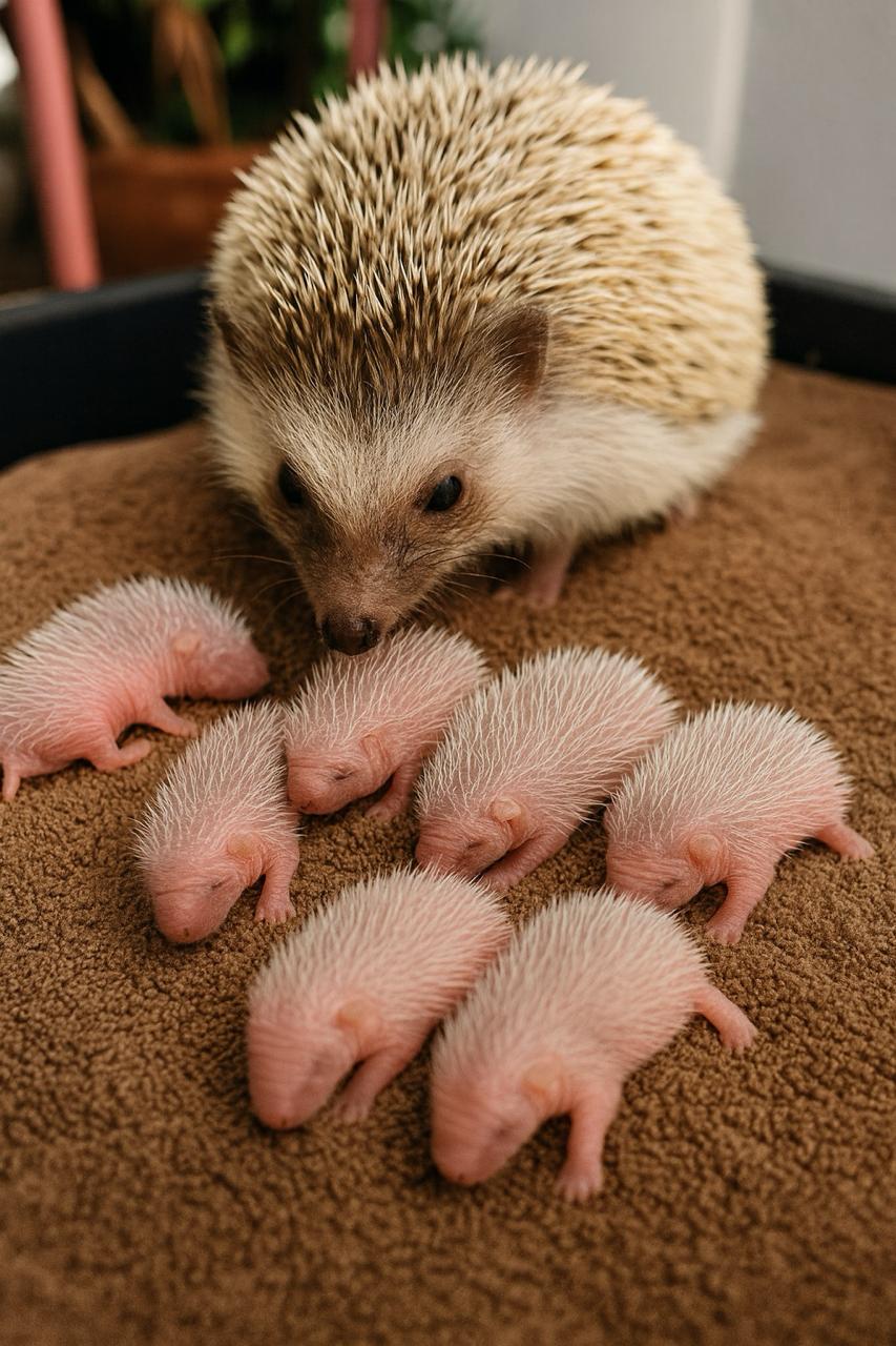 Luna alatt hét apró, rózsaszín, szinte földönkívülinek tűnő teremtmény feküdt, puha fehér tollakkal borítva. Mozogtak, csipogtak, kinyújtották miniatűr orrukat, és egyáltalán nem hasonlítottak a klasszikus, aranyos sünökre, amelyeket a fényképeken megszoktunk látni.
