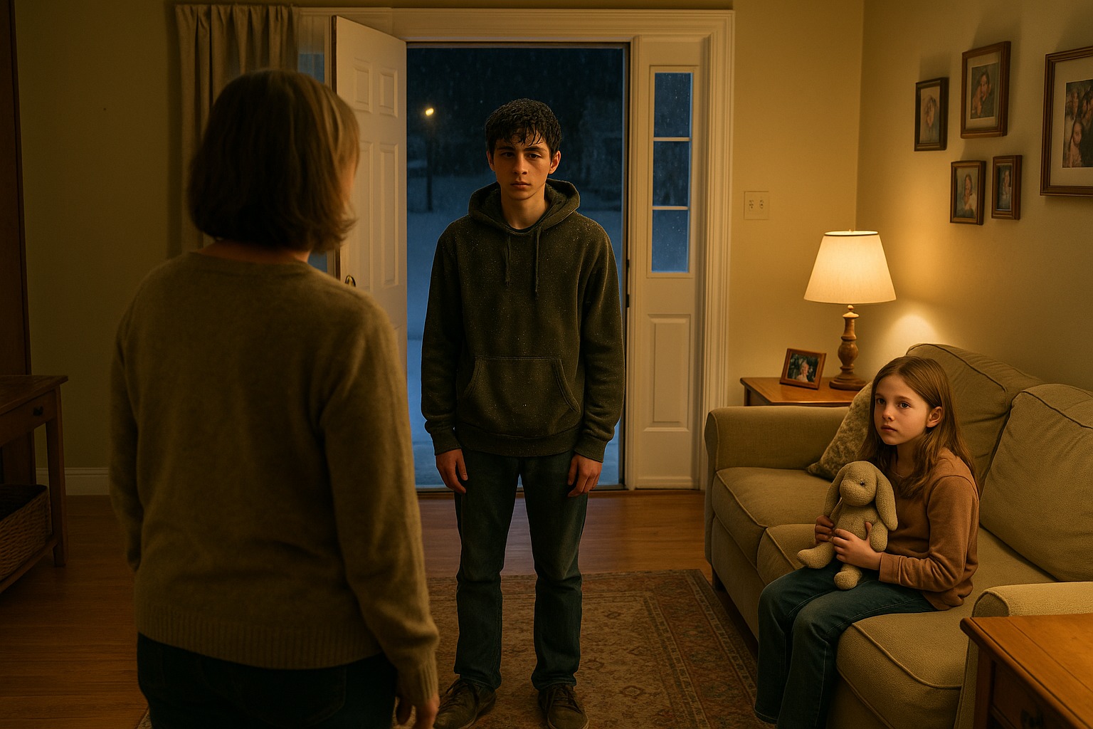 A verandán egy tinédzser állt egy túlméretezett kapucnis pulóverben, arca sápadt volt az utcai lámpa fényében. Nedves hó tapadt a hajába. Nem lehetett több tizenötnél, de a válla úgy görnyedt, mint egy öregemberé.