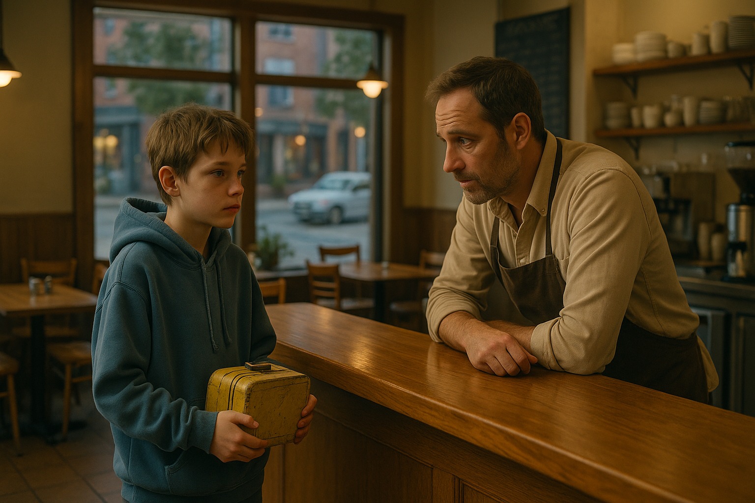 A fiú, aki folyton műanyag uzsonnásdobozt hozott a kávézóba, és kért egy „gyerekadagot hazavitelre”, végül egy esős estén rávette a tulajdonost, hogy kövesse.