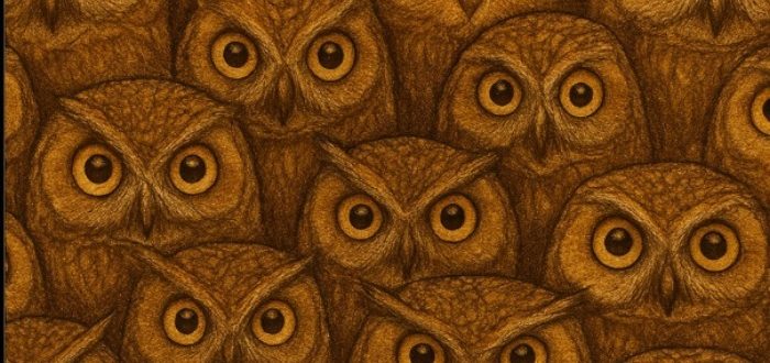 Első pillantásra a kép csupán egy sűrű bagolycsapatnak tűnik, hatalmas, kerek szemekkel. Szinte mindannyian szinte egyformák, egyetlen mintázatba olvadnak, és egyenesen a lelkedbe néznek. De a művész csapdát
