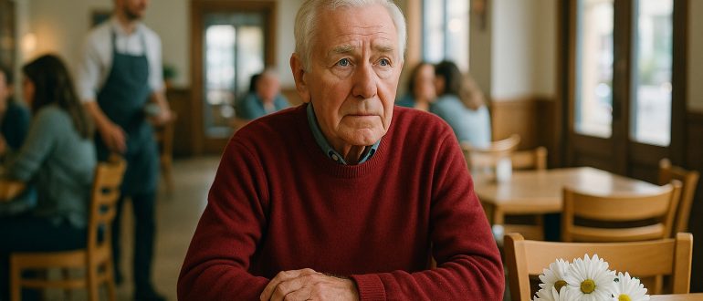 A piros pulóveres öregember egyedül ült a zsúfolt étteremben, és az ajtót bámulta, mintha valaki fontos személy késne, de a pincér azt súgta, hogy már három éve minden